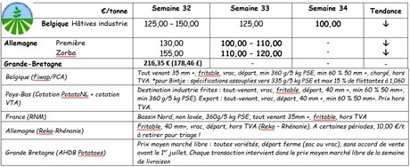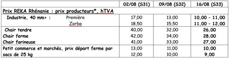 Prix en veiling / criée de Roulers (source : REO via PCA) : le 19 août : Prix pondéré (rouges et blanches) pour pdt ramassées à la main : 0,33 €/kg hors TVA. Appro : 27 tonnes.