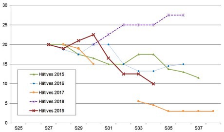 Hâtives industrielles : marché calme, avec peu de demande de la part des industries qui se contentent des volumes contractés. L’export est demandeur vers les pays de l’Est. L’offre reste présente, en raison des surtonnes (issues des bons rendements) et de la transition prévue prochainement vers d’autres variétés (Bintje, Innovator) chez certains acheteurs.