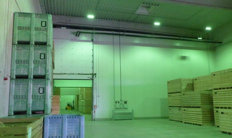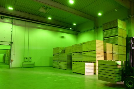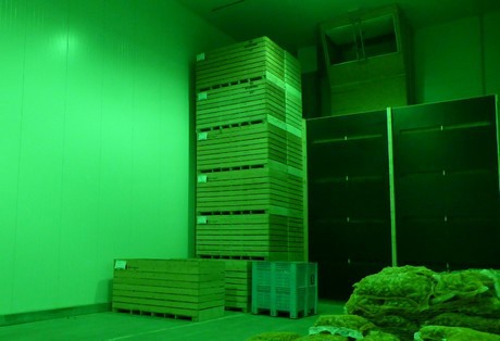 La « lumière verte LED » empêche le verdissement et la formation de toxines dans la pomme de terre ; un facteur décisif pour son stockage et sa transformation. Grâce au rendement lumineux élevé des luminaires LED Conpower jusqu'à 145 lm/W et à une technique de commande adaptée aux procédures de fonctionnement, des économies d'énergie de 70 à 80 % sont réalisées.