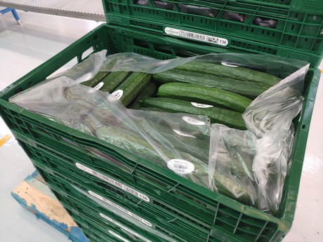 Au niveau de l'emballage, la demande de concombres nus, non recouverts de plastique, est en plein essor. Pour faciliter le transport, les caisses sont recouvertes d'un sac recyclé dès leur arrivée », explique JM López, qui explique en détail le processus :