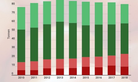 Les barres rouge foncé et rouge pâle représentent la production nationale et le volume des importations de tomates cerises.