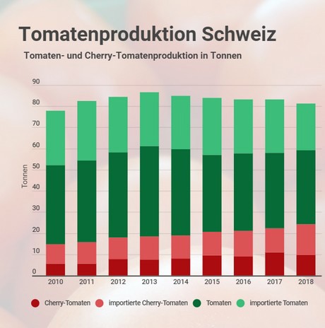 Les tomates sont parmi les légumes suisses les plus populaires. La plupart des tomates proviennent du sol suisse, à l'exception de la tomate cerise, dont la part des importations est supérieure à la production nationale.