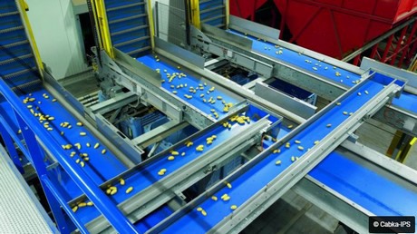 Après la récolte et le lavage, les pommes de terre sont triées selon un système de tri optique - en fonction de leur taille - après quoi elles sont placées dans les caisses-palettes. Selon les besoins, les cartons chargés sont stockés dans des alvéoles ou acheminés directement vers la chaîne de conditionnement. Lors d'une utilisation ultérieure, une benne basculante intégrée au système peut vider automatiquement les boîtes dans les lignes de conditionnement correspondantes. L'ensemble du processus de manutention, de l'arrivée des produits à l'expédition des produits finis, s'effectue sans une seule étape manuelle.