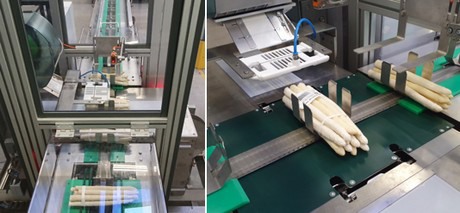 De plus, le processus est plus rapide car le regroupement et l'étiquetage se font en une seule opération. « Dans le passé, un ouvrier emballait les asperges dans un sac en plastique et les étiquetait ensuite avec un autre employé. Désormais, ces deux étapes ont été combinées pour réduire la quantité de sacs en plastique », explique Mertens.