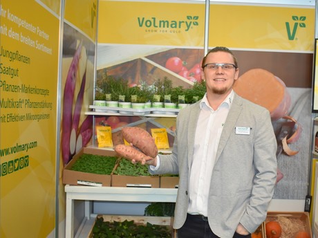 Manuel Scheuring conseille et assiste ses clients dans le sud de l'Allemagne. Lors de l'ExpoSE de cette année, il a informé les clients et les parties intéressées des nouvelles variétés de Volmary LLC. L'image montre la patate douce Erato Deep Orange déjà établie.