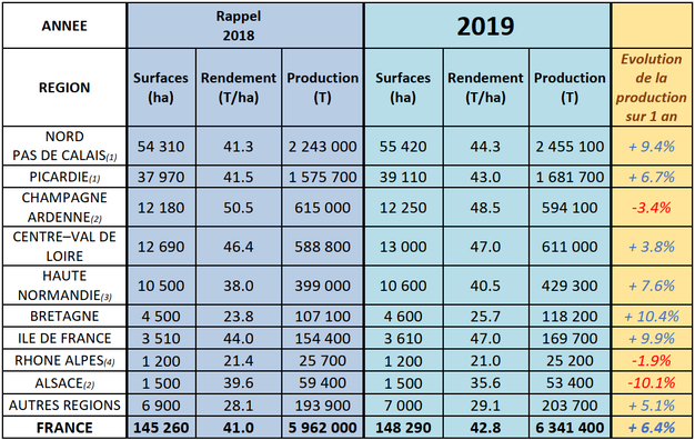 Les surfaces, qui couvrent 148 290 ha, avaient de nouveau augmenté de 2.1 % sur un an. Le rendement brut moyen s’établit à environ 42.8 t/ha en 2019. Il est en hausse de 4.4 % par rapport à l’année dernière, prenant près de 2 t/ha en un an, et confirmant ainsi les tendances observées dans les prélèvements en parcelles réalisés par l’UNPT en cours de végétation (à savoir un rendement meilleur que l’année dernière, mais sensiblement inférieur à la moyenne pluriannuelle).