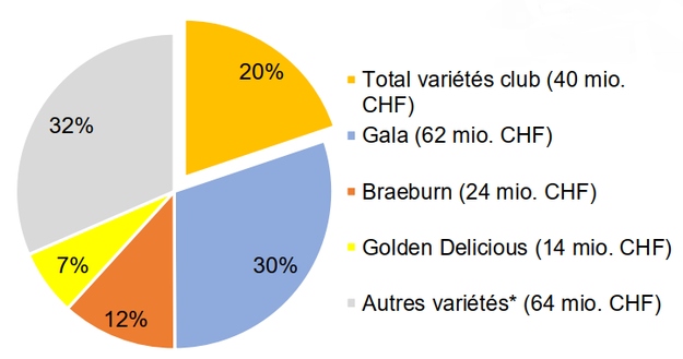 La pomme est l’un des fruits les plus vendus en Suisse : il s’en écoule au détail près de 60 000 tonnes par an. Les variétés club sont apparues il y a une vingtaine d’années ; leur production et leur commercialisation obéissent à une organisation précise. Cette catégorie de pommes comprend actuellement une vingtaine de variétés totalisant quelque 15 % des ventes au détail ; leurs parts de marché sont stables. À ce jour, aucune ne se vend aussi bien que les variétés communes les plus populaires telles que la Gala, la Braeburn ou la Golden Delicious. Néanmoins, les variétés club étant plus chères que les autres, elles représentent au total près d’un cinquième