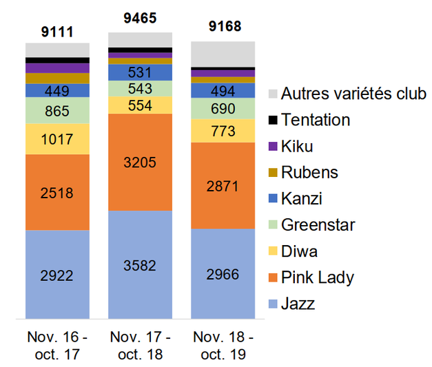 à 2018 et se chiffrent à 652 hectares. La production des autres variétés, qui couvre 2 792 hectares, accuse un recul de 1 % sur la même période. (Les pommes à cidre, les variétés dont la culture occupe moins de 40 ares ainsi que d’autres variétés non recensées ne sont pas incluses dans ce chiffre.) Si les variétés club représentaient 17 % de la production en 2015, cette proportion est passée à 19 % en 2019. Toutes les pommes issues de ces vergers ne sont toutefois pas commercialisées sous l’un des noms en question, notamment parce que toutes ne répondent pas aux canons des marques variétales.