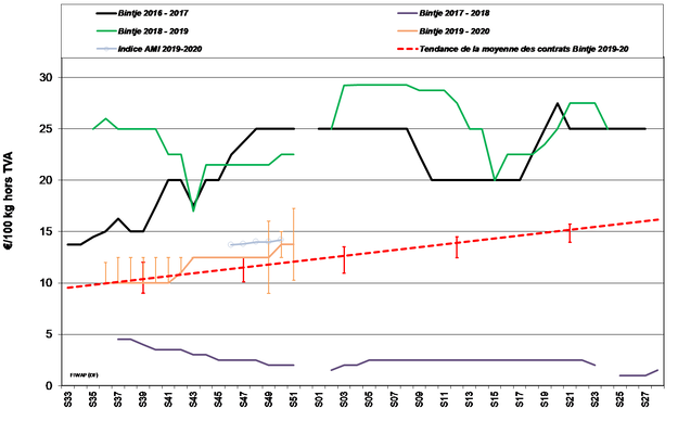 Bintje : 12,50 – 15,00 €/q ; les principaux industriels continuent de payer le prix de base, mais certains éplucheurs trouvent difficilement les lots adéquats et paient jusqu’à 15,00 €/q pour la qualité supérieure (gros calibre, bonne cuisson) ;
