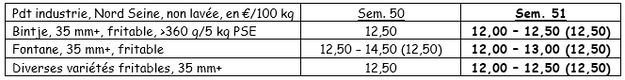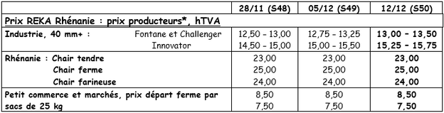 Fontane : 12,50 – 13,00 €/q ; des lots de gros calibre et de top cuisson sont achetés par des exportateurs jusqu’à 15,00 €/q pour l’Angleterre (industrie et épluchage) ;