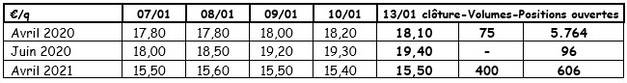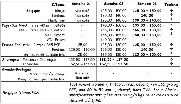 Les marchés redémarrent… Les bonnes qualités sont recherchées par les négociants – emballeurs ! Marché du frais, cours fermes en chairs fermes à 23,25 €/q (contre 23,17 €/q) en ce début d’année ainsi qu’en chairs tendres & farineuses à 21,58 €/q (contre 21,33 €/q). Marché de la transformation : cotations stables mais fermes actuellement tant en Fontane / Challenger à 13,25 – 13,75 €/q (inchangé) et stables en Innovator à 15,25 – 15,75 €/q (inchangé).