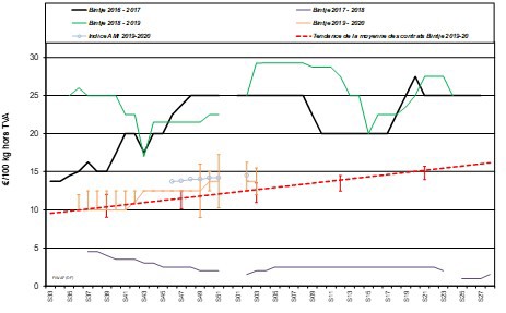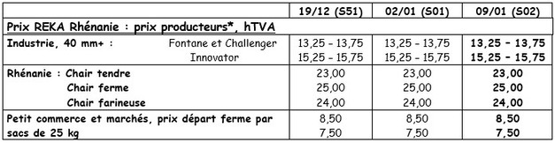 Bintje : 12,50 – 15,00 €/q selon grosseur, qualité et destination. Les éplucheurs trouvent de plus en plus difficilement les lots adéquats et paient jusqu’à 15,00 €/q pour la qualité supérieure (gros calibre, bonne cuisson) ;