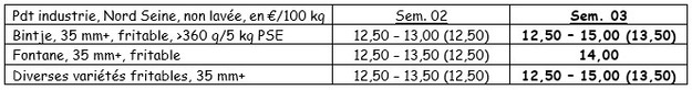 Pdt industrielle, vrac, départ, hTVA, Nord Seine, €/qt, min – max (moy) (RNM) :
