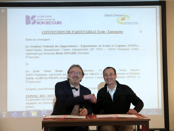 Dans les tuyaux depuis le début de cette campagne 2019/2020, le lycée Notre Dame de Bon Secours de Perpignan et le Syndicat National des Importateurs / Exportateurs de Fruits et Légumes de Saint-Charles (SNIFL) ont signé, ce jeudi 16 janvier 2020, une Convention de Partenariat.