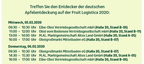 L’inventeur de la marque Fräulein®, Gerd Sundermeyer de la région de Hildesheim, expliquera lors du salon Fruit Logistica comment il a laissé libre cours à la nature et a ainsi trouvé sa pomme préférée. Les 5 et 6 février, il sera présent dans le hall 20 sur les stands de Obst vom Bodensee Vertriebsgesellschaft mbH, Obstgroßmarkt Mittelbaden eG, Marktgesellschaft Altes Land et Elbe-Obst Vertriebsgesellschaft mbH, où il présentera sa Fräulein®.