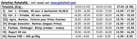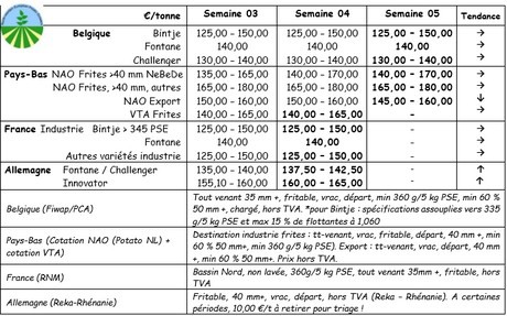 Les marchés sont fermes, tant en caisses-palettes-frigos qu’en variétés pour l’industrie de la frite. Marché du frais, cours toujours fermes en chairs fermes à 23,50 €/q (contre 23,50 €/q) comme en chairs tendres & farineuses à 21,75 €/q (contre 21,71 €/q). Le secteur s’attend à ce que les cours montent de 2,00 à 4,00 €/q pour les stockages caisses-frigo dans les jours ou semaines qui viennent. Marché de la transformation : cotations à nouveau en hausses tant en Fontane / Challenger à 13,75 – 14,25 €/q (13,50 – 14,00 €/q ) et qu’en Innovator à 16,00 – 16,50 €/q (15,50 – 16,00 €/q) qui sont particulièrement recherchées. L’industrie tourne à plein régime et on signale des hangars (tant « frites » que « chips/croustilles ») qui se vident… Les acheteurs ne veulent pas payer plus, les vendeurs s’attendent à des cours plus élevés en fin d’hiver/ début de printemps.