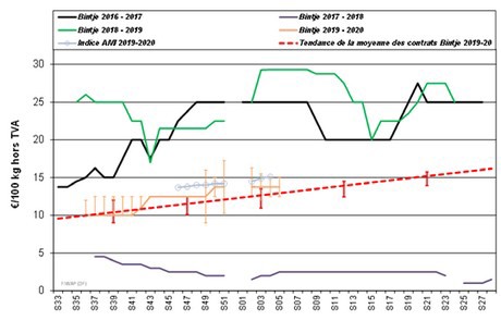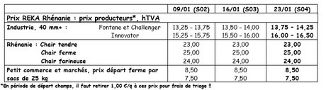 Bintje : 12,50 – 15,00 €/q selon grosseur, qualité et destination. Les éplucheurs trouvent de plus en plus difficilement les lots adéquats et paient jusqu’à 15,00 €/q pour la qualité supérieure (gros calibre, bonne cuisson) ;