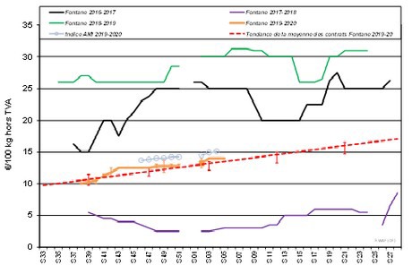 Fontane : autour de 14,00 €/q ; des transactions pour livraison retardée sont mentionnées à prix supérieurs ;