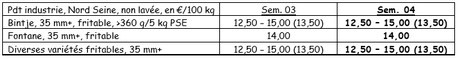 Pdt industrielle, vrac, départ, hTVA, Nord Seine, €/qt, min – max (moy) (RNM) :