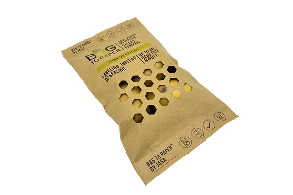 Outre les emballages susmentionnés, JASA a mis au point une véritable innovation en 2019 : le Bag-2-Paper ™. Ce type d'emballages en papier est fabriqué sur les machines d'emballage à scellage vertical de JASA sans scellage, et ne comporte donc pas de revêtement plastique à l'intérieur de l'emballage.
