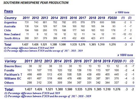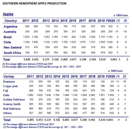 La WAPA a discuté et publié les prévisions de récolte consolidées pour les prochaines saisons de pommes et de poires de l'hémisphère sud (voir les chiffres). Recueillies auprès d'associations professionnelles en Argentine, en Australie, au Brésil, au Chili, en Nouvelle-Zélande et en Afrique du Sud, ces prévisions montrent que les récoltes de pommes et de poires de l'hémisphère sud devraient atteindre respectivement 5 003 000 et 1 276 000 tonnes en 2020.