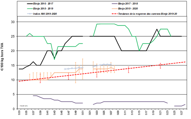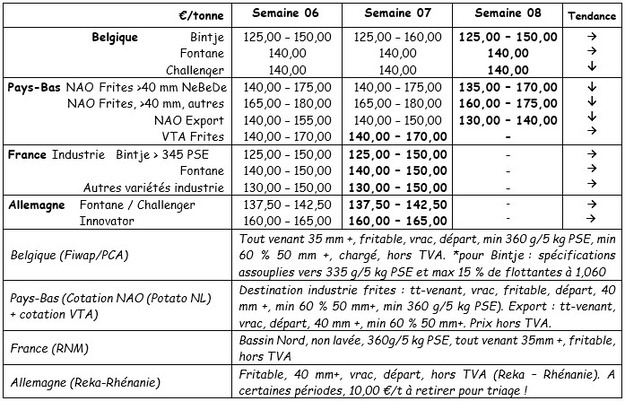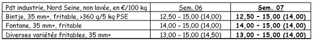 Bintje : 12,50 – 15,00 €/q, selon grosseur, qualité et destination. Marché, avec moins d’activités « dans le haut de la fourchette » ;