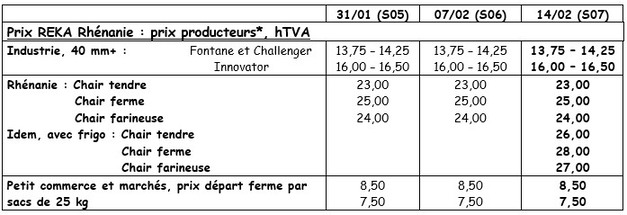 Le commerce libre est quasi inexistant. L’industrie ne semble pas avoir besoin de compléter ses contrats pour terminer le mois de février. Malgré ce « grand calme », les cotations restent inchangées et les transactions réelles se font entre 14,50 et 16,50 €/q pour livraison directe (40 mm+) selon les variétés (Fontane vs Ramos ou Innovator). Du commerce pour avril est observé entre 16,00 et 18,00 €/q. L’export est lent, avec quelques volumes sur base de 12,00 à 15,00 €/q. Des volumes vendus précédemment doivent encore partir, mais néanmoins on s’attend à une meilleure demande des pays de l’Est d’ici la fin de la saison.
