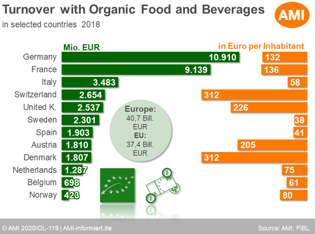 Bien que l'Allemagne soit le pays qui dépense le plus pour l'alimentation biologique, des pays comme la Suisse et le Danemark sont en tête en ce qui concerne les dépenses par habitant.