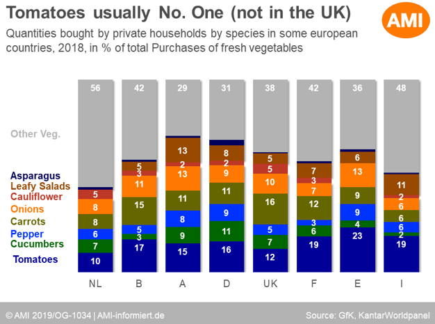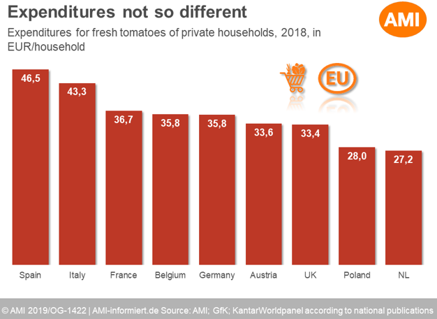 Les tomates sont les produits horticoles frais les plus populaires dans presque tous les pays européens (sauf au Royaume-Uni, où les carottes sont les plus populaires). L'Espagne, l'Italie et la Pologne sont les principaux acheteurs et consommateurs, surtout pendant les mois d'été mais, si l'on regarde le chiffre d'affaires, les différences ne sont pas si grandes.
