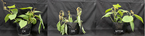 Pour l'étude, 100 µM de mélatonine exogène ont été utilisés pour irriguer les plants de kiwis dans des conditions de sécheresse, qui ont été analysés aux niveaux transcriptomique et physiologique. Les scientifiques ont évalué les transcriptomes des feuilles de kiwi sous contrôle (CK), DR (stress de sécheresse), et MTDR (sécheresse plus mélatonine).Effets du prétraitement à la mélatonine sur les plants de kiwis exposés à la sécheresse. CK, échantillons bien arrosés ; DR, échantillons prétraités à l'eau, puis stressés par la sécheresse pendant 9 jours ; MTDR, échantillons prétraités avec une solution de mélatonine de 100 µM, puis stressés par la sécheresse pendant 9 jours.