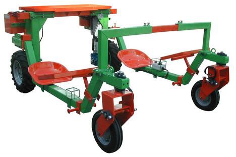 La machine est en position de transplantation, avec un rouleau denté pour le forage de trous et il y a deux supports centraux pour le repiquage manuel.