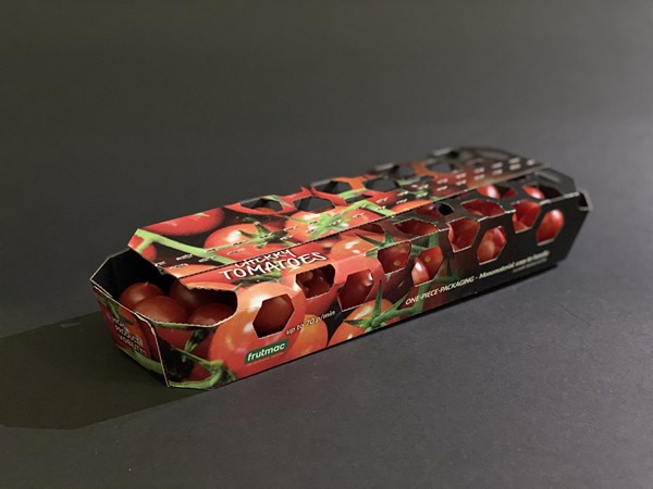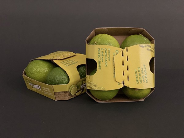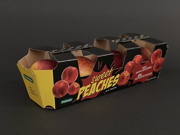 Les ailes latérales enveloppent les fruits ronds et les maintiennent en place grâce à leur forme. Comme pour l'option Flat®, les vents latéraux ferment le conteneur horizontalement et le paquet est alors rempli. Nous sommes arrivés à une nouvelle « ère de personnalisation » qui n'utilise pas seulement des mises en page graphiques pour promouvoir les produits, mais où le contenant lui-même devient le protagoniste du marketing de détail.