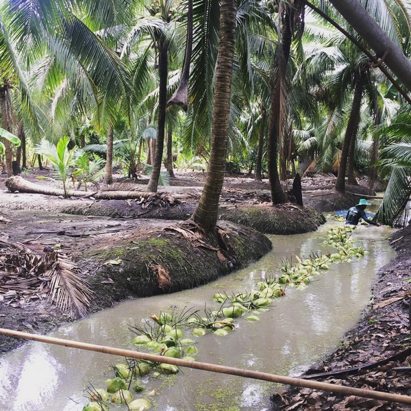 Jeunes noix de coco récoltées dans une des fermes avec lesquelles Explosive Foods travaille. Les noix de coco sont récoltées par des gens qui utilisent de longues perches.