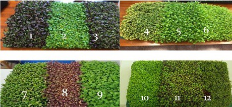 Les espèces de micropousses étudiées : 1. Komatsuna ; 2. Tatsoi ; 3. Pak choi ; 4.Cresson ; 5. Mibuna ; 6. Mizuna; 7. Bette à carde ; 8. Amarante ; 9. Coriandre ; 10. Basilic vert ; 11. Basilic pourpre ; 12. Pourpier.