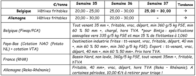 Pas d’animation supplémentaire des marchés industriels, mais les prix ne baissent pas pour autant. Les conditions de plus en plus sèches pour arracher (hors parcelles irrigables évidemment) contribuent même à la « fermeté » des cours, qui restent situés entre 2,50 et 3,00 €/q. Les usines travaillent à 80 – 90 % de capacité en moyenne, et certaines prennent des surtonnes, d’autres se limitent strictement aux volumes contractés. Les hâtives se terminent (cette semaine ou la semaine prochaine). Les marchés du frais tournent normalement, sur base de prix entre 10,00 et 17,00 €/q. L’export cherche le prix d’équilibre sur base de 10,00 à 13,00 €/q (calibré départ big-bag) noté la semaine passée, avec un peu de demande pour l’Afrique.