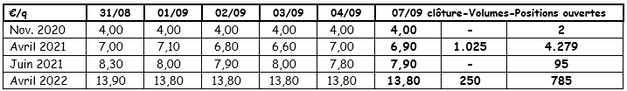 Récapitulatif des cours €/t (source : NEPG) :