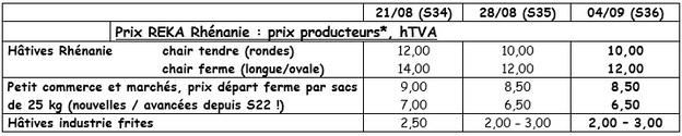 Marché du frais (hâtives et mi-hâtives) : nouvelle baisse des cours, tant en chair ferme : 12,25 €/q (14,83 €/q la semaine passée) qu’en chair tendre/farineuse : 11,08 €/q (13,50 €/q la semaine passée). Les cours baissent, l’offre étant plus importante que la demande, notamment à cause de hâtives qui pèsent sur le marché et du marché à l’export quasi inexistant. La très faible consommation lors de 1 à 2 semaines de fortes chaleurs n’a pas aidé…