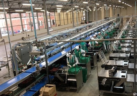 Sur la photo ci-dessus : ligne de traitement pouvant accueillir jusqu'à 56 opérateurs en plein fonctionnement, utilisée seulement pour 20 % des volumes commercialisés par la société (NB : photo prise avant l'urgence Covid)