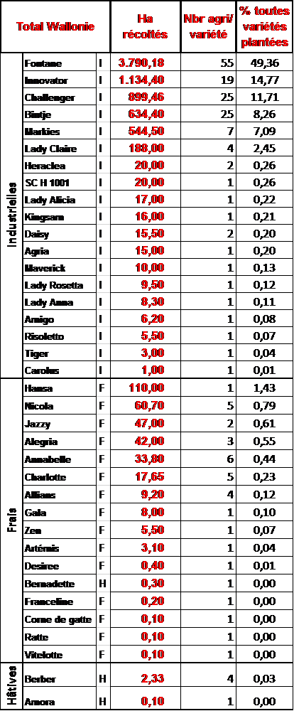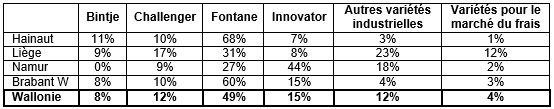 En variétés industrielles, Fontane poursuit sa progression avec quasi 50 % des surfaces. Elle est produite par deux tiers des producteurs enquêtés. Elle relègue loin derrière Innovator (15 % des surfaces, stable) et Challenger (12 %, en recul). Bintje (8 %) poursuit sa baisse et est à présent talonnée par Markies (7 %) qui progresse lentement mais sûrement. Lady Claire est inchangée à 2,5%. Toutes les autres variétés occupent moins de 0,5 %, avec une série de nouveautés : Heraclea, Lady Allicia, Kingsam, Maverick, Risoletto, Tiger. Par contre, Royal, Divaa, Victoria, VR808 et Crisper ont disparu de la production des producteurs enquêtés.