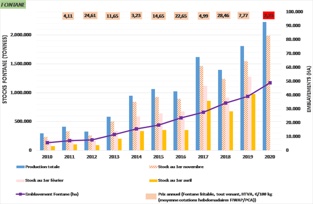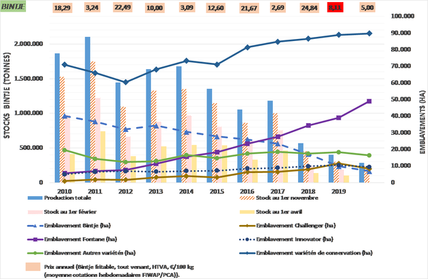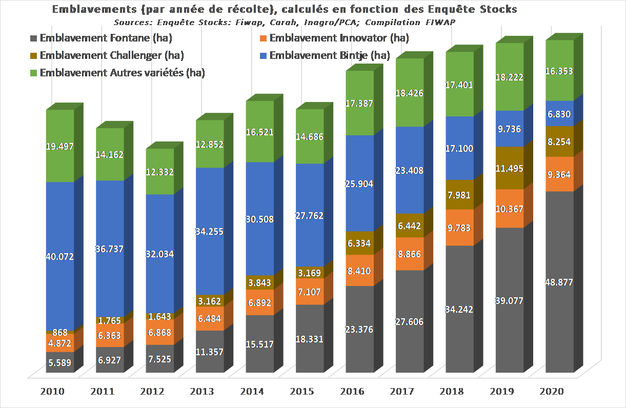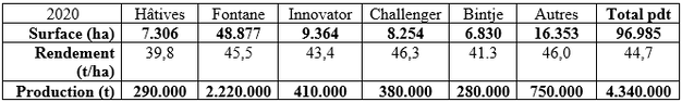 La production 2020 de hâtives est évaluée à 290.000 tonnes, et celle de Bintje à seulement 280.000 tonnes (voir tableau 4). Fontane fournit plus de 50 % de la production belge).