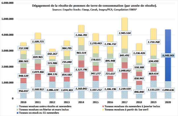 Toutes variétés confondues, les stocks belges au 15 novembre sont estimés à 3,25 Mt, très semblable à l’an dernier et à la moyenne des 3 dernières années. Cela représente 80 % de la production brute initiale. La part contractée est importante (2,41 Mt), ce qui ne laisse que 840.000 tonnes de libres. Les marchés ont dégagé depuis le début de saison environ 800.000 tonnes, dont seulement 170.000 tonnes achetées en libre (le plus faible chiffre de ces 6 dernières années). Covid-19 et difficultés de récolte ont clairement réduit les achats hors contrat.