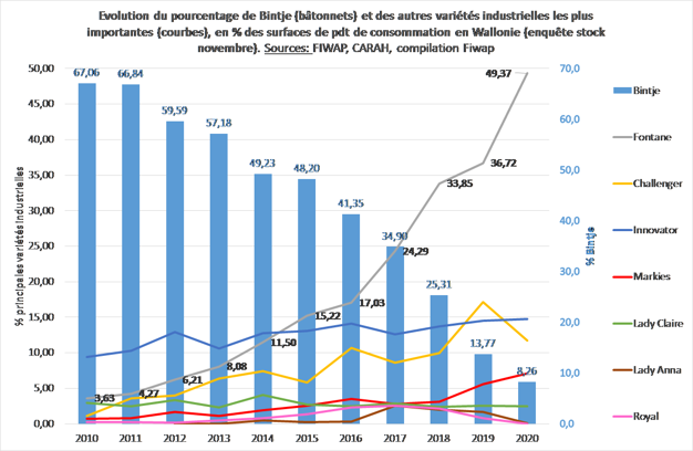 Dans la production belge, Fontane est devenue très dominante avec 2,22 Mt à elle seule (soit plus de 50 % !), tandis que Bintje ne représente plus que 6 % de la production nationale.
