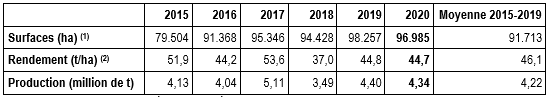 Le rendement moyen brut 2020 sortie champ (hâtives comprises) est évalué à 44,7 t/ha, très semblable à l’an dernier et à la moyenne des 3 dernières années (45,0 t/ha). Sur les 5 dernières saisons, la moyenne est de 46,1 t/ha.