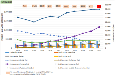 Innovator : selon l’enquête, il y aurait 240.000 tonnes d’Innovator dans les hangars belges au 15 novembre, dont 220.000 tonnes sous contrat, et seulement 20.000 tonnes libres. Le stock représente moins de 60 % de la production initiale, car plus de 40 % ont été dégagés en sortie champ et début novembre.