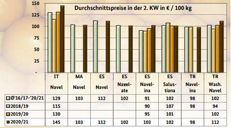 Parmi les oranges blondes, les Navelinas espagnoles ont surpassé toutes les autres variétés en termes de quantité sur le marché. Les Navels d'Italie et d'Espagne et les Salustianas d'Espagne ont complété la gamme. Au Maroc, il y avait la Salustiana et la Navel. Les premières Navelinas d'Espagne sont arrivées assez tôt dans la saison. Les chutes de neige et les basses températures ont amélioré les possibilités de vente. Des hausses de prix ont été observées à diverses occasions : à Munich, par exemple, les prix des oranges Washington Navel de Turquie ont augmenté. En raison du mauvais temps dans les régions espagnoles, on s'attend à des prix généralement plus élevés à partir de la troisième semaine.