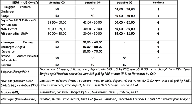 Bintje, Fontane, Challenger : 6,00 à 7,00 €/q, avec les prix le plus élevés pratiqués pour compléter des contrats. Marchés fermes.