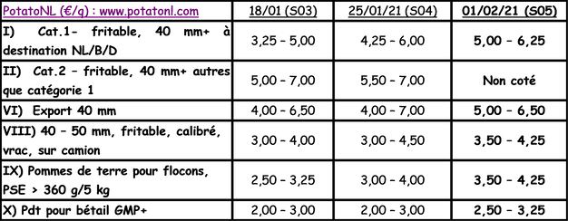 Pour l’industrie, la hausse des prix suit les tendances ressenties en Belgique et en Allemagne. Des transactions entre 5,00 et 6,00 €/q pour livraison immédiate ont été observées la semaine passée en Fontane / Challenger, ainsi que des offres d’achat pour livraison retardée à 7,00 €/q pour février, 8,50 €/q pour fin avril et 9,00 à 10,00 €/q pour mai et juin. Innovator bénéficie d’un euro supplémentaire. Les marchés intérieurs du frais tournent bien grâce aux bonnes ventes en distribution, et les cours se maintiennent. L’export manque de volume par contre, ce qui maintient les prix au producteur à un bas niveau (4,00 à 6,50 €/q). L’Espagne et le Portugal restent intéressés, tandis que l’Ukraine s’informe sans vraiment passer à l’achat.