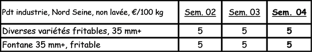 Pdt industrielle, vrac, départ, hTVA, Nord Seine, €/qt, min – max (moy) (RNM) :