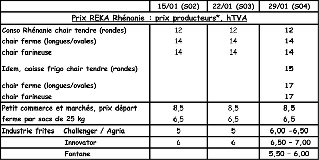 Marché du frais (hâtives et mi-hâtives) : prix des chairs fermes inchangé : 10,83 €/q (10,83 €/q, avant dernière cotation) et inchangé également en chairs tendres/farineuses : 10,25 €/q (10,25 €/q, avant dernière cotation). Les hausses pour le « caisse – frigo » se voient déjà dans les cotations du REKA (tableau plus bas). Dans le Sud-ouest du pays (Sarre, Bade-Wurtemberg) les origines françaises augmentent, comme chaque année en milieu d’hiver.
