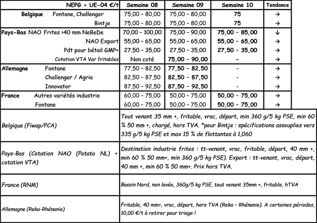 Bintje, Fontane, Challenger : principalement 7,50 €/q. Marchés calmes ; des prix légèrement supérieurs (jusqu’à 8,00 €/q) restent pratiqués pour la frite fraiche (Bintje, mais aussi Challenger).